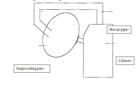 1.Kazan saat yönünde dönerek şurup ve karışık şurup malzemelerini kazandaki çipin üzerine birkaç kez püskürtür, şurupla karıştırılan malzemenin çip üzerine eşit şekilde kaplanmasını ve şeker kaplı tabletlerin kazanda yuvarlanmasını sağlar.Bu arada, tabletler üzerindeki yüzey nemini kurutmak ve sertifikalı şeker kaplama hapları üretmek için kazana sıcak hava üflenir.